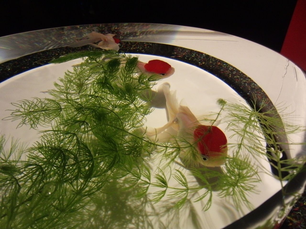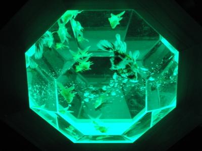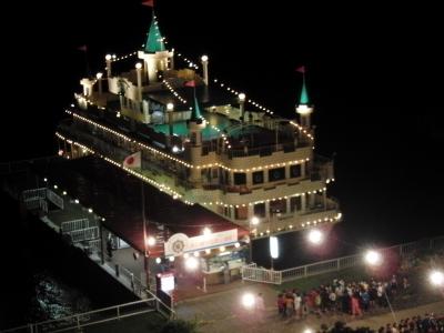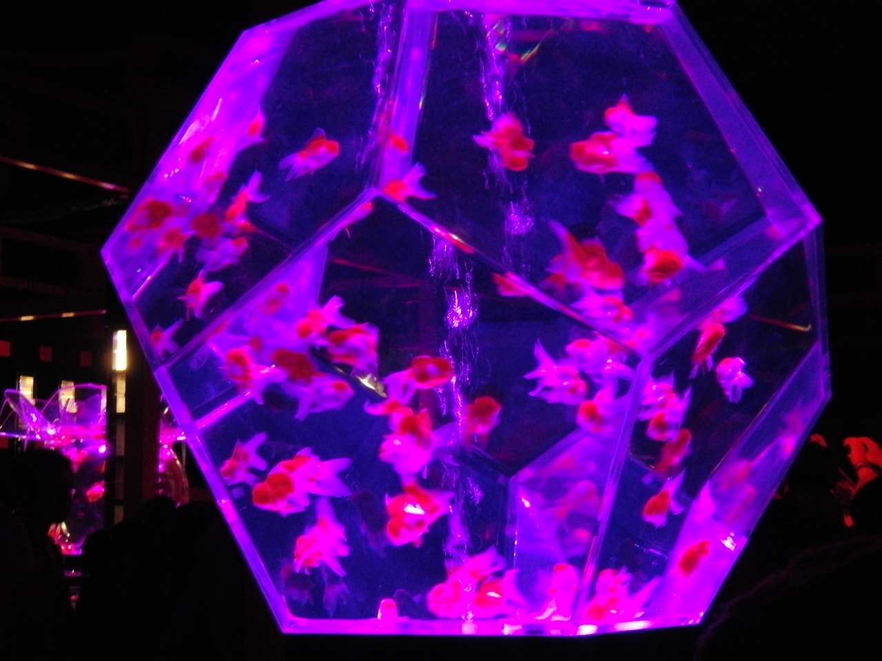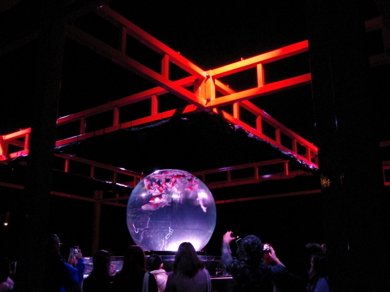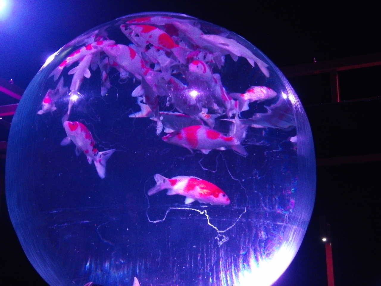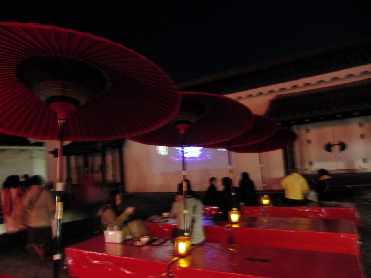 - 赤い柱と金魚の水槽とのライトアップ・バックの二条城も良い味出しています