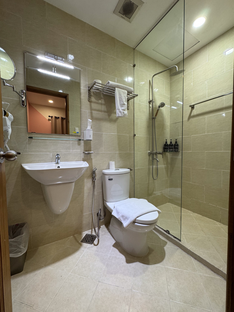 客室は中々広くキレイ。シャワーブースが半分オープンなのとシャワーが固定式なのが不満。