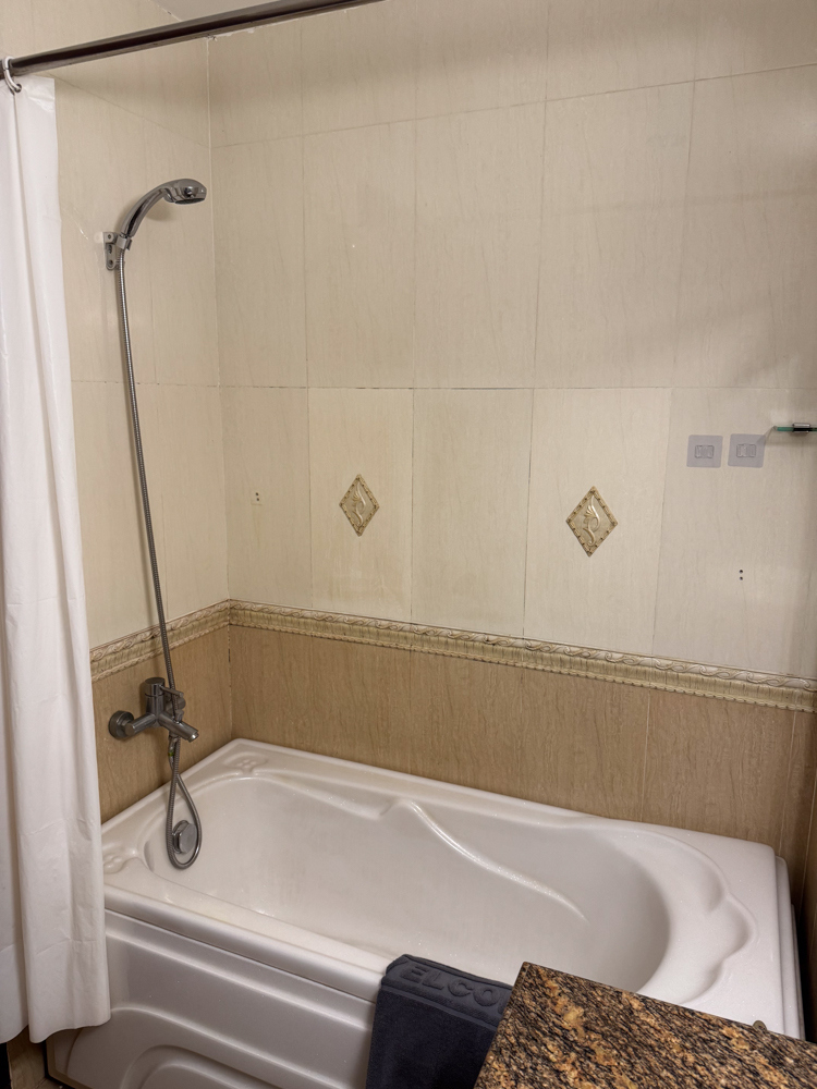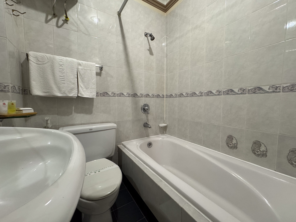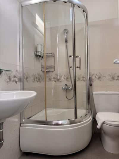 浴室はバスタブはあるがシャワーが固定式のみ。アメニティはシャンプーとバスジェル.お湯と水圧量は問題なし.