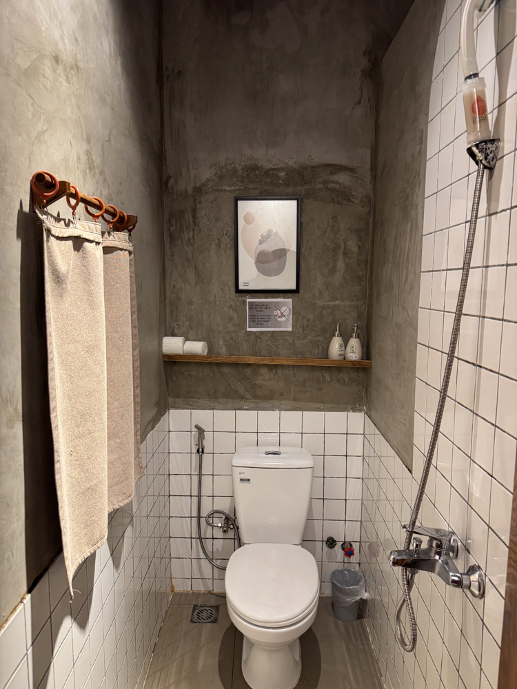 個人的に最大の問題は,トイレとシャワーが完全に一体になっていること.シャワーを浴びるとトイレの床もびしょびしょになります.そのためにビーサンが備え付けれれています.あとシャワー水圧が弱めです.