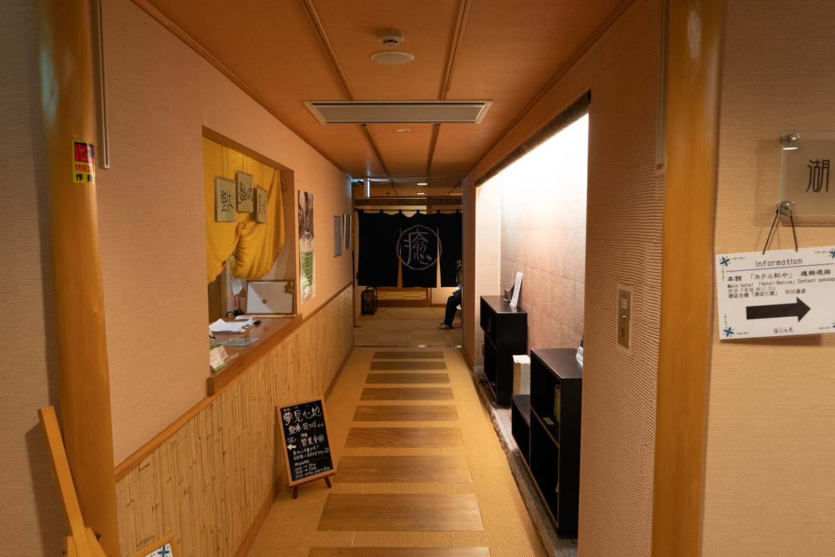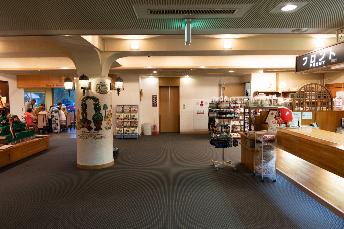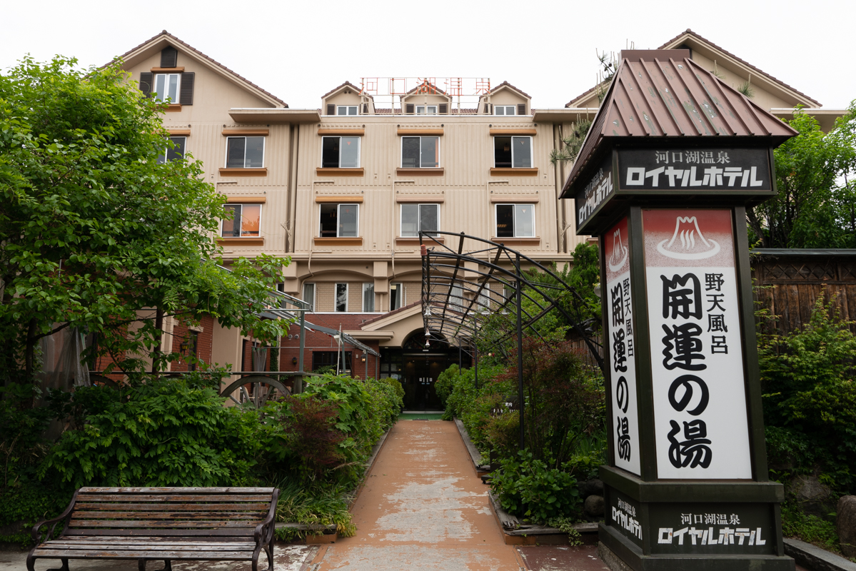立地は河口湖のすぐそば、徒歩5分以内にコンビニやレストランあり。なんとなく全体的に古い感じのするホテルです。
