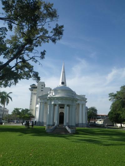 ジョウジタウンの無料バス青、赤両バス停近くで簡単に行けます。近くには博物館、市庁舎、ビクトリア時計台など観光スポットも数多くあります。建物の入り口に行くと注意されます。空の青、強い日差しが照りつける白亜の建物、青い芝生が綺麗です。