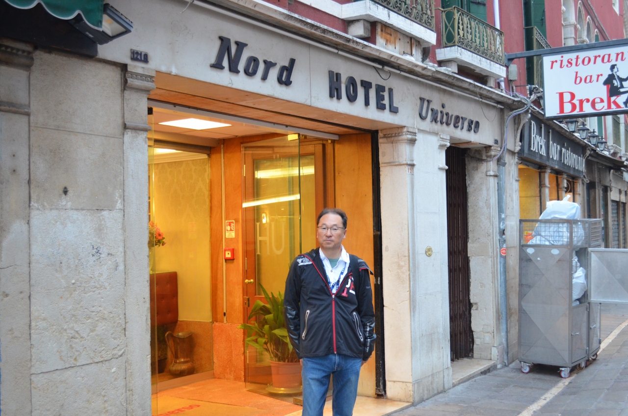対応は横柄に見えるが実はイタリア語が少し話せれば非常にフレンドリーで親切に対応してくれた。いろいろ話したがフロントにある洪水の写真で盛り上がった。(水難の相がるのかな?)
