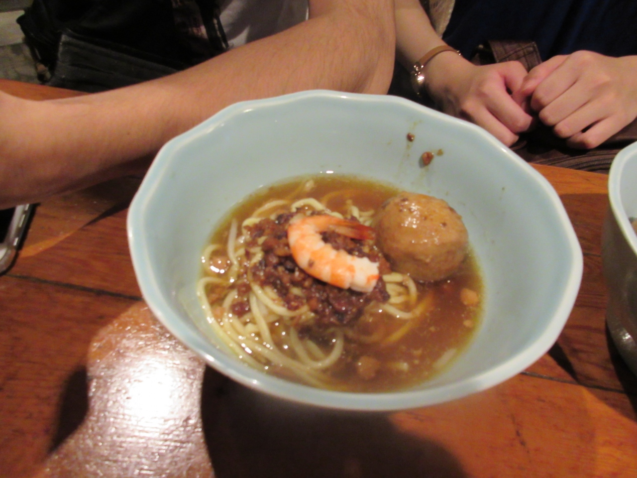 このお店の口コミが高かったので行ってみました。元祖 擔仔麺と言うのが有名と言う事で注文。パクチ−とニンニクは入れるかどうか聞かれたのでどちらも苦手な私達は抜いてもらいました。安平エビロールはいちばん美味しかったです。肉燥飯はお肉のそぼろ丼のイメ−ジで注文したのが間違いで、油だらけでこれは苦手でした。元々は台南のお料理らしいですね。私は微妙でした。