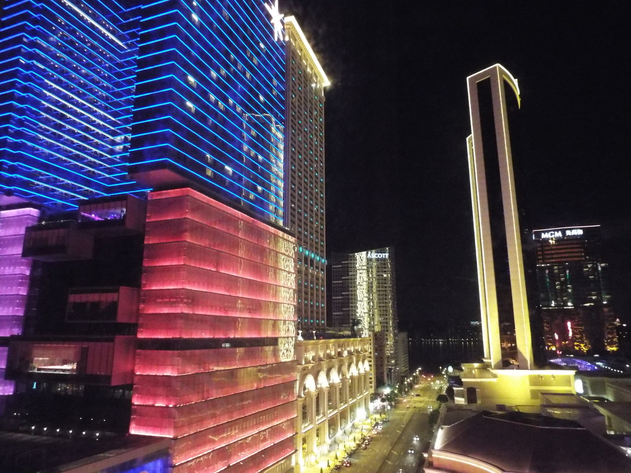 夜はネオンが光り輝く高層ビル群に位置し、近くにはカジノやレストラン、ショッピングモールがいくつもあります。ホテル内にも本格的なカジノがあります。