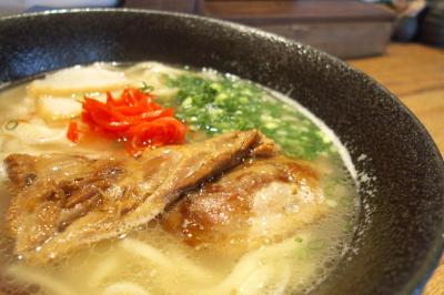 「そば」といいつつも蕎麦粉は一切不使用、平打ちでモチモチッとした食感の沖縄そばを啜りつつ