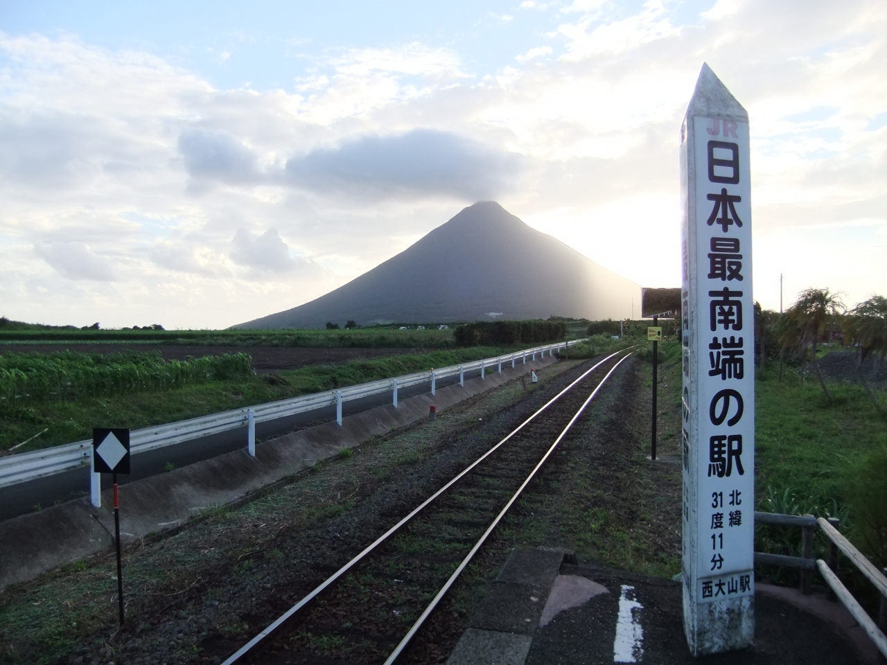 JR西日本最南端の指宿枕崎線の西大山駅から見る開聞岳の夕日は