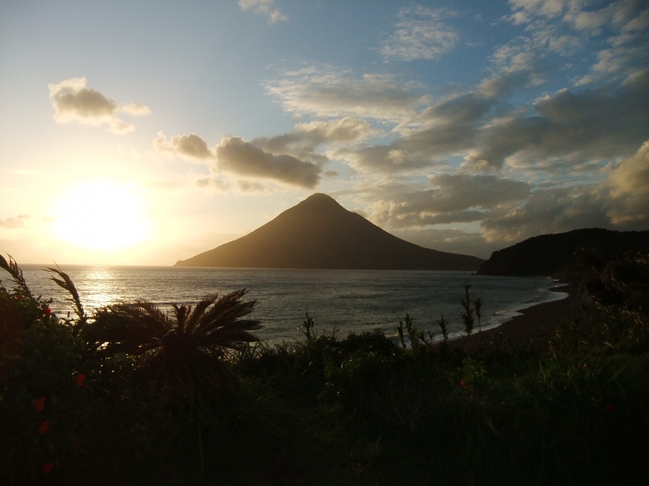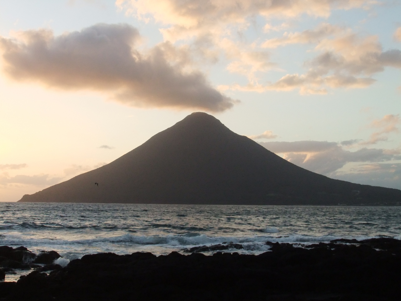 鹿児島県の南西の岬から眺める開聞岳はまるで海に浮かぶよう。