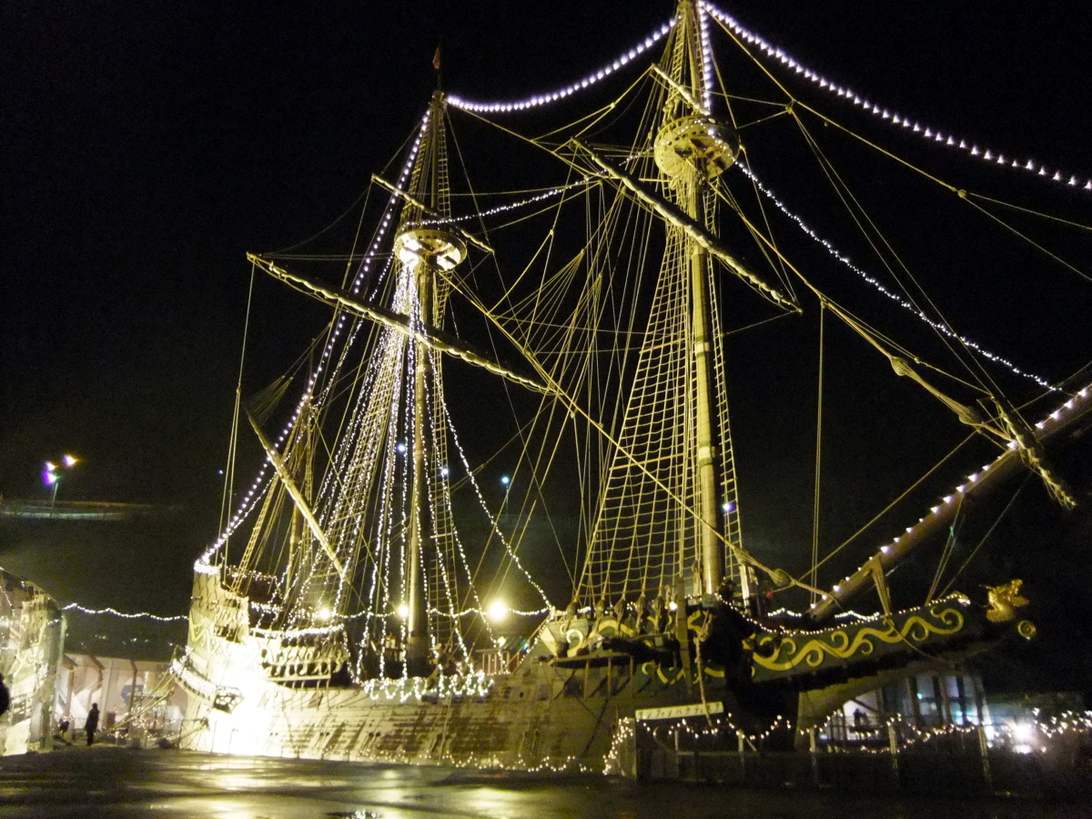 石巻市にある宮城県慶長使節船ミュージアム内の「サン・ファン・バウティスタ号」をイルミネーションで彩ります。