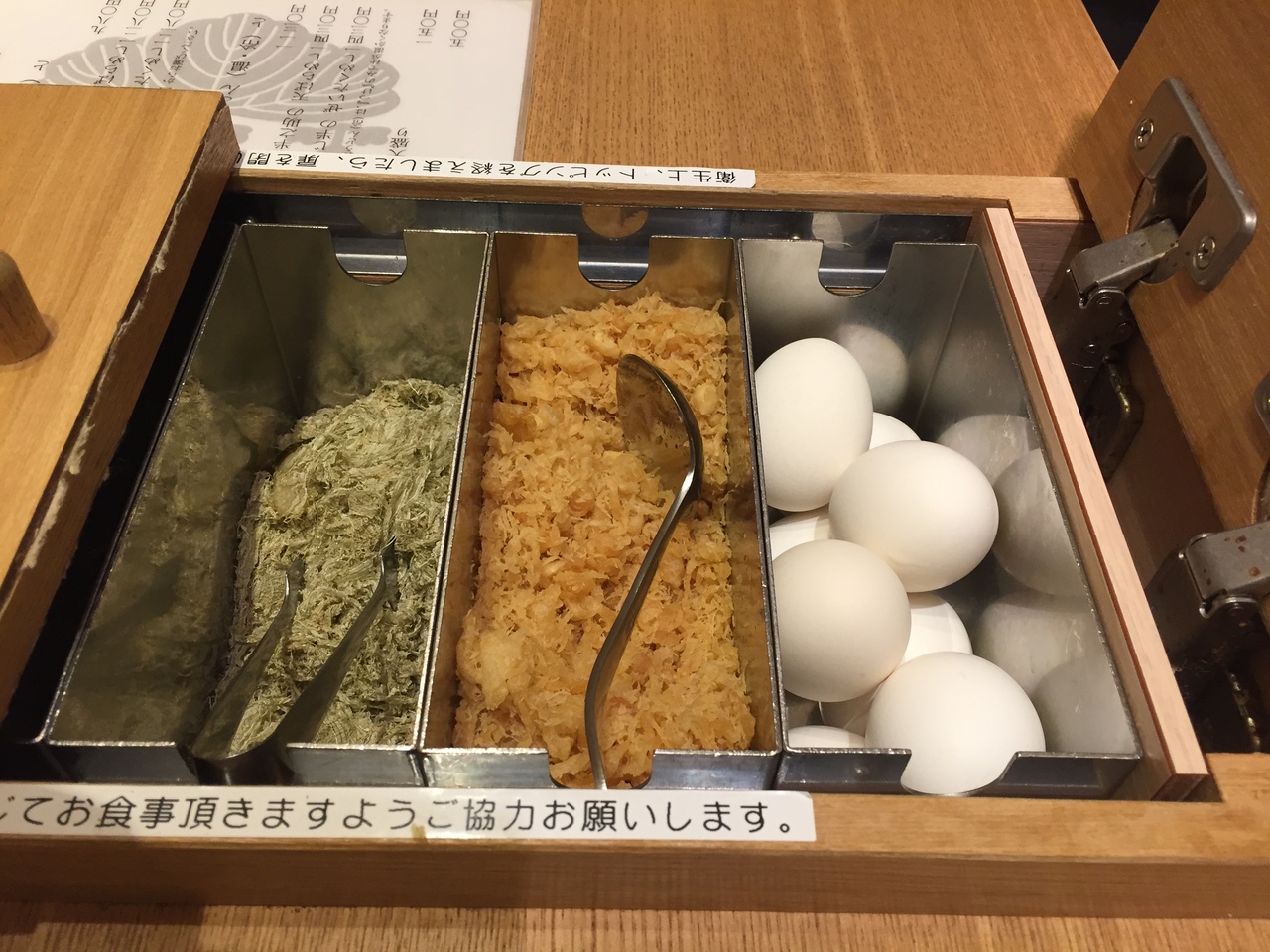 テーブル毎に置いてある、おうどんのトッピングは入れ放題と太っ腹ではありますが、メインが稲庭うどんなので、天丼や海鮮丼を食べたい人には、物足りなさを感じます。