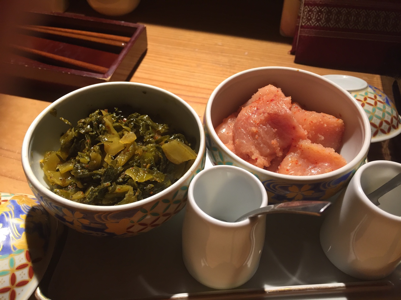 テーブルには明太子と辛子高菜が置いてあり、食べ放題になっています。