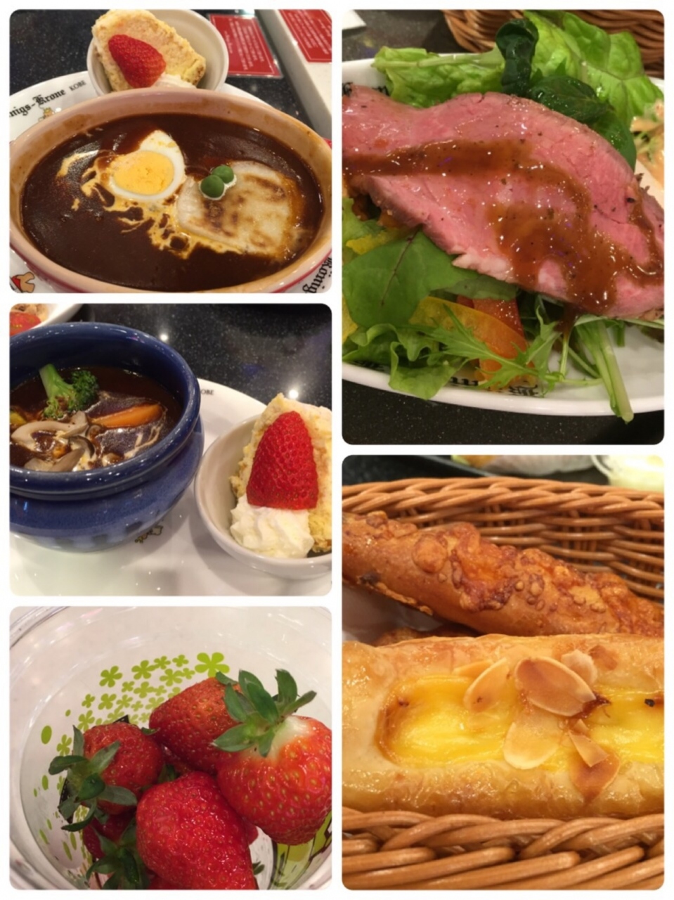 今日伺った時はサラダにローストビーフが添えられてました。先着50人にはケーニヒスクローネ自慢のお菓子クローネが食べられます。期間限定ではありますが、今は苺も別料金でつけられます。パンはちょっと大きいので、個数は食べられないかもしれませんが、種類はあります。時間の制限もないし「苺は時間制限あり」ソファでゆったりとランチが頂けるので、子供さん連れでも気兼ねなく行けると思います。- 旅行時期