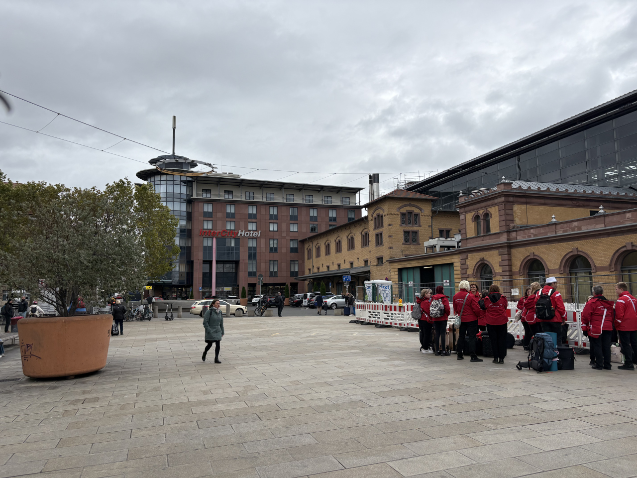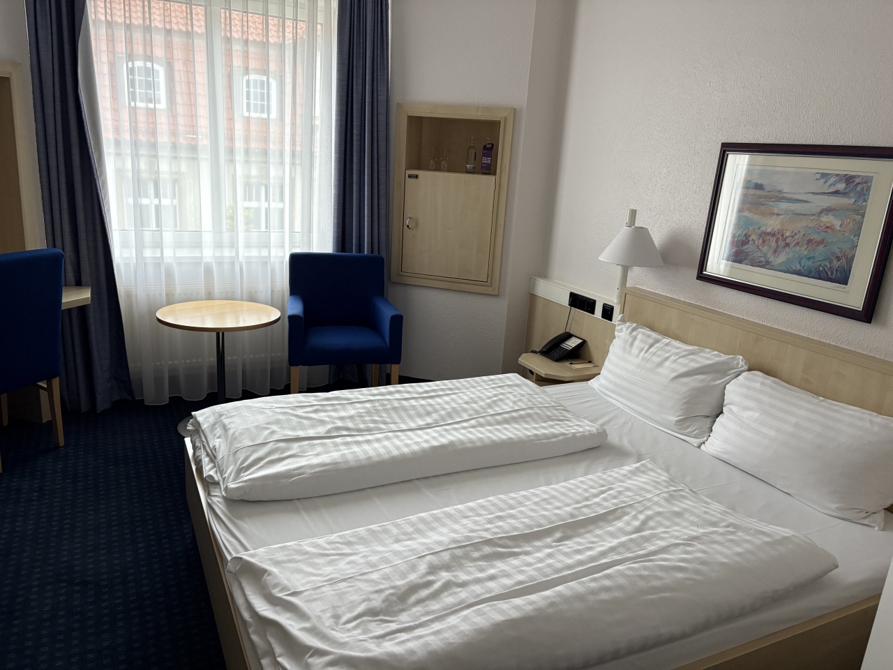 エアフルト駅を出て、すぐ左に見えます。徒歩5分程度です。ホテルのフロントはややつっけんどんな対応でした。部屋は一人旅だったので十分に広かったです。バスはバスタブなしでした。部屋の清掃は普通でした。鉄道旅行には便利なホテルだと思います。ほかの同程度のホテルと比較すると安かったです。