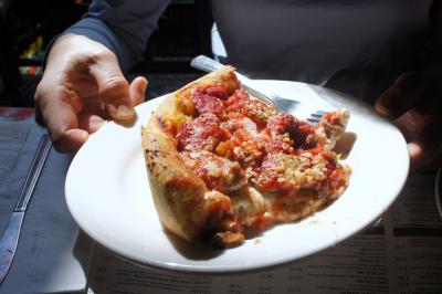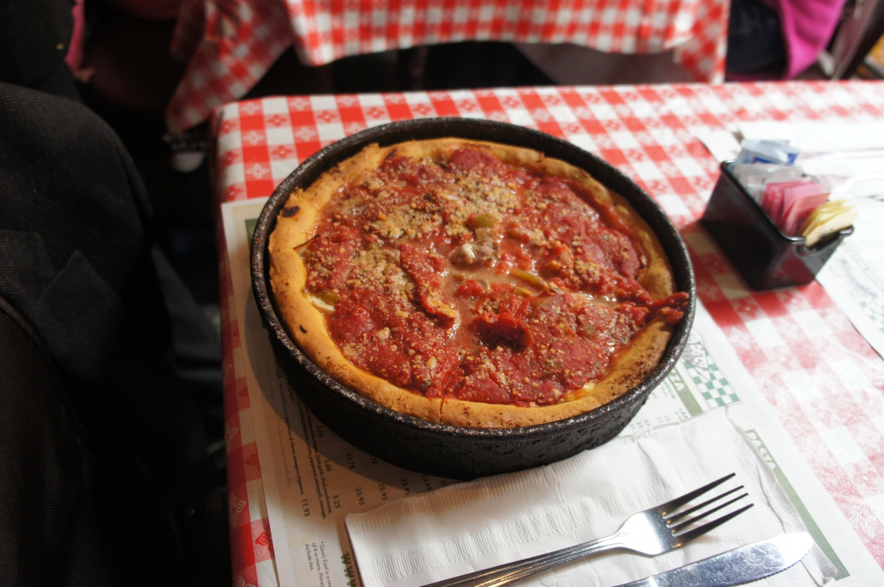 シカゴピザはスモールでも、すき焼き用の鉄鍋のようなもので焼いてあり、とても全部食べれるようなものではありませんでした。半分だけ食べて、残りはテイクアウトしました。冷めても十分に美味しかったです。