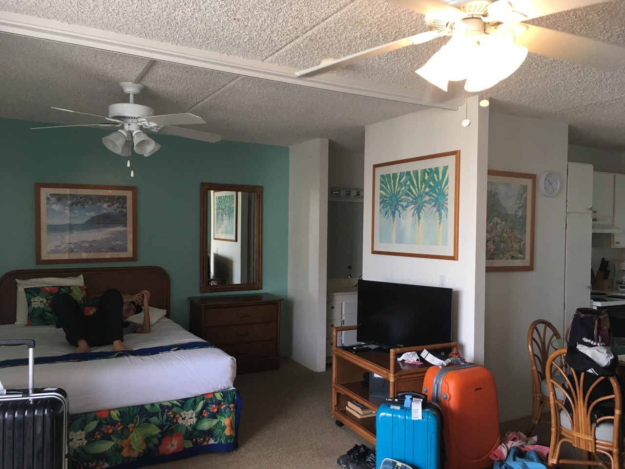 便利な場所にあります。目の前にはバス停がありピンクトローリーの出発場所のデューティフリーも近いです。ロイヤルハワイアンも徒歩3分ぐらいですね。海まで徒歩5分ぐらいです。部屋も広くかわいかったです。ただエアコンがうるさいのとトイレの水がとまらなかったのが残念です。