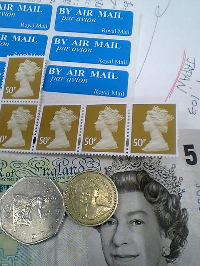 イギリスのお金(ポンド)と絵葉書用の切手です。