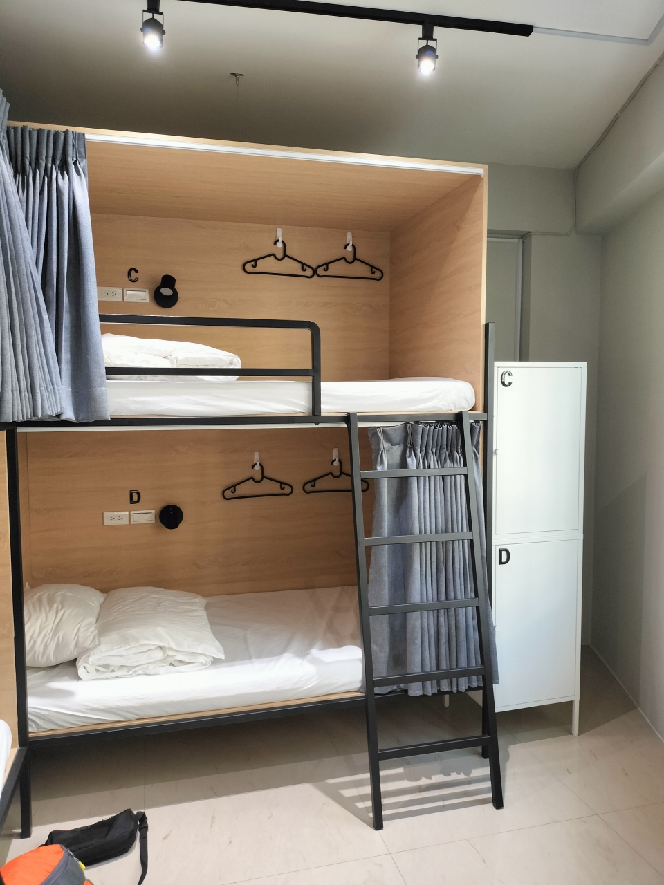 美麗島駅 出口1から1分。アクセスがともかく良い。先にリクエストすると下段のベットをあてがってもくれて、荷物預かりもしてくれます。シャワー室は狭いので、着替えるものは全て濡れないようにビニールバックに入れてフックで吊るしました。ベッドにハンガーを掛けるポールがついているのでここに、洗濯ものを干しました。小さいピンチを日本から持っていて、小物はこちらへ。外の階段の踊り場に干すところがあるのでそこへ大きいものは干しました。値段もかなりお値打ちなんでおすすめ。