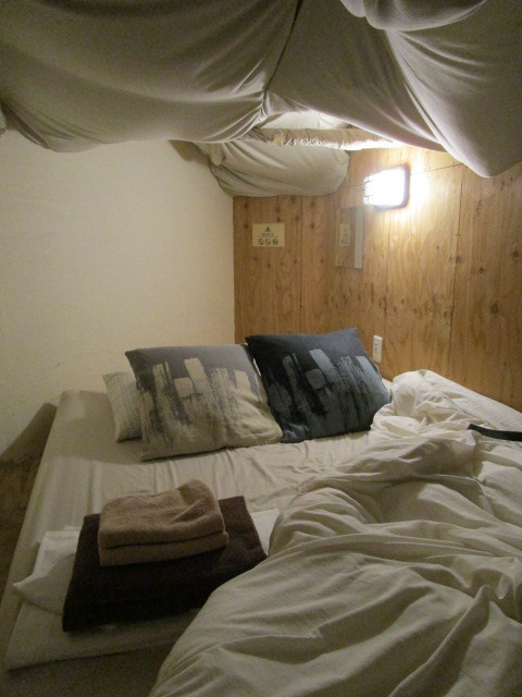 部屋はダブルベットくらいの広さで、シーツとタオルがついてます