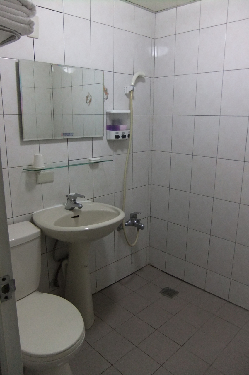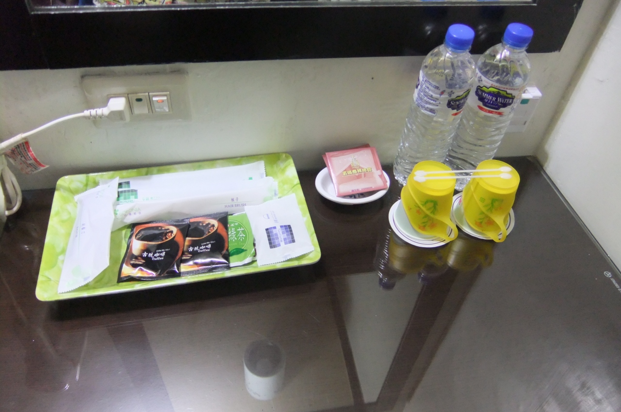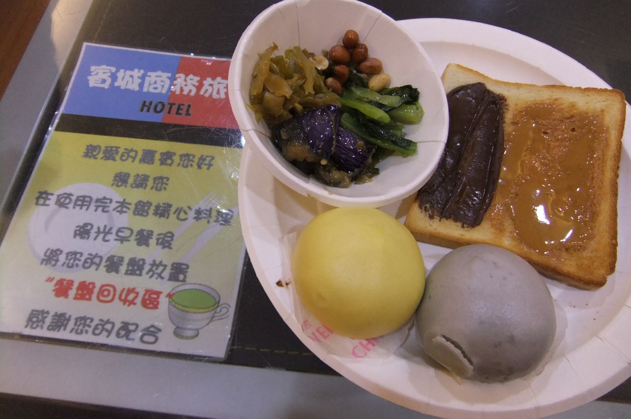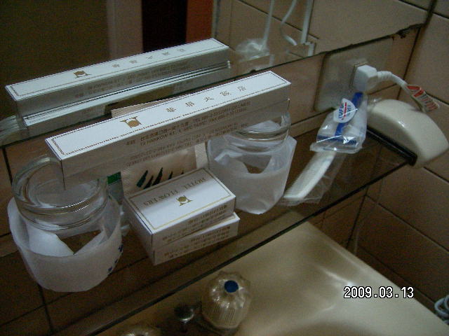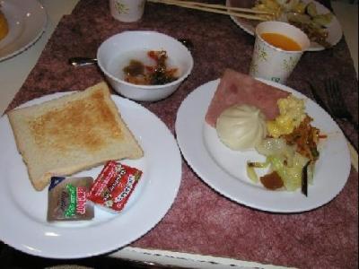 お部屋がラッキーだったのですが、通常ツインって部屋にベットが二つですが、私たちの部屋は部屋自体が二つに分かれてました。冷蔵庫・TV・浄水器(これは怪しいので使いませんでした)お風呂も広く、結構片付いていてアジアのホテルにしてはまあまあだったと思います。朝ごはんは1Fの食堂でビュッフェ式。おかゆ、饅頭、パン、おかず、オレンジジュースや果物など、メニューはあまり変らないけどおかゆなんかは付け合せみたいなのもあるので満足。フロントの人も結構丁寧でいい感じです。あと近くにコンビニがあるのでそこでお水とかお茶を買って飲みました。