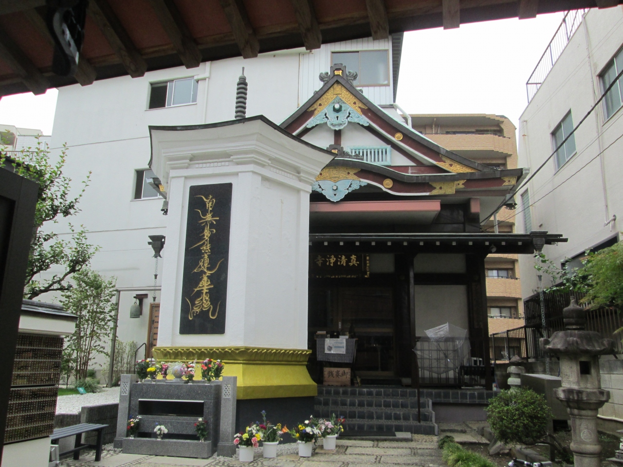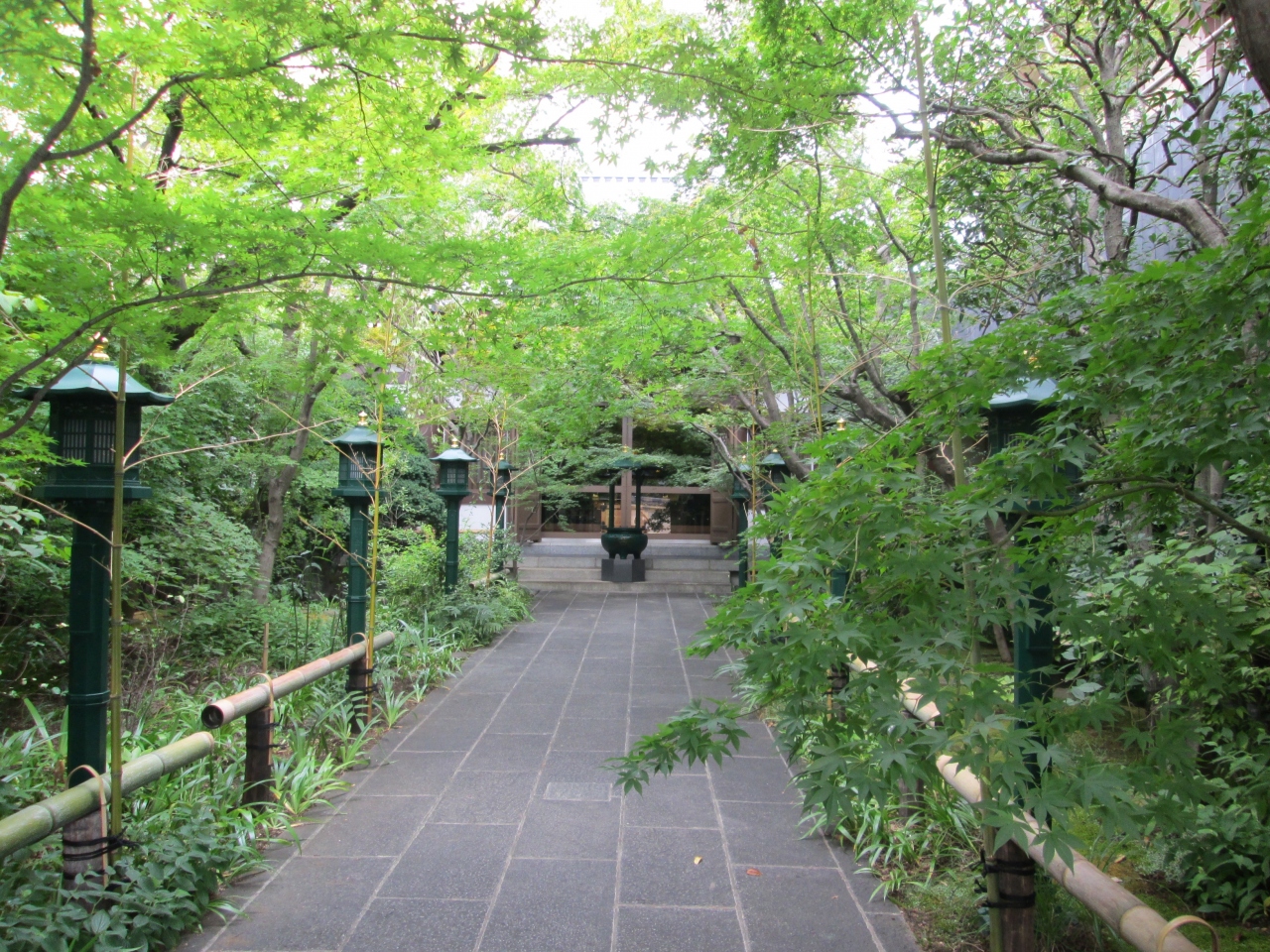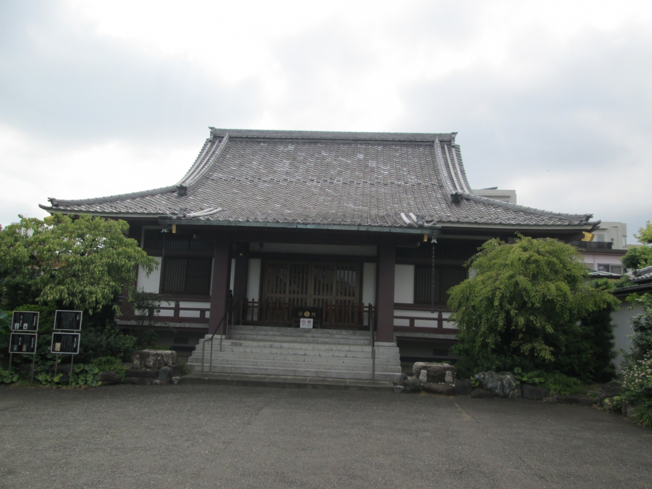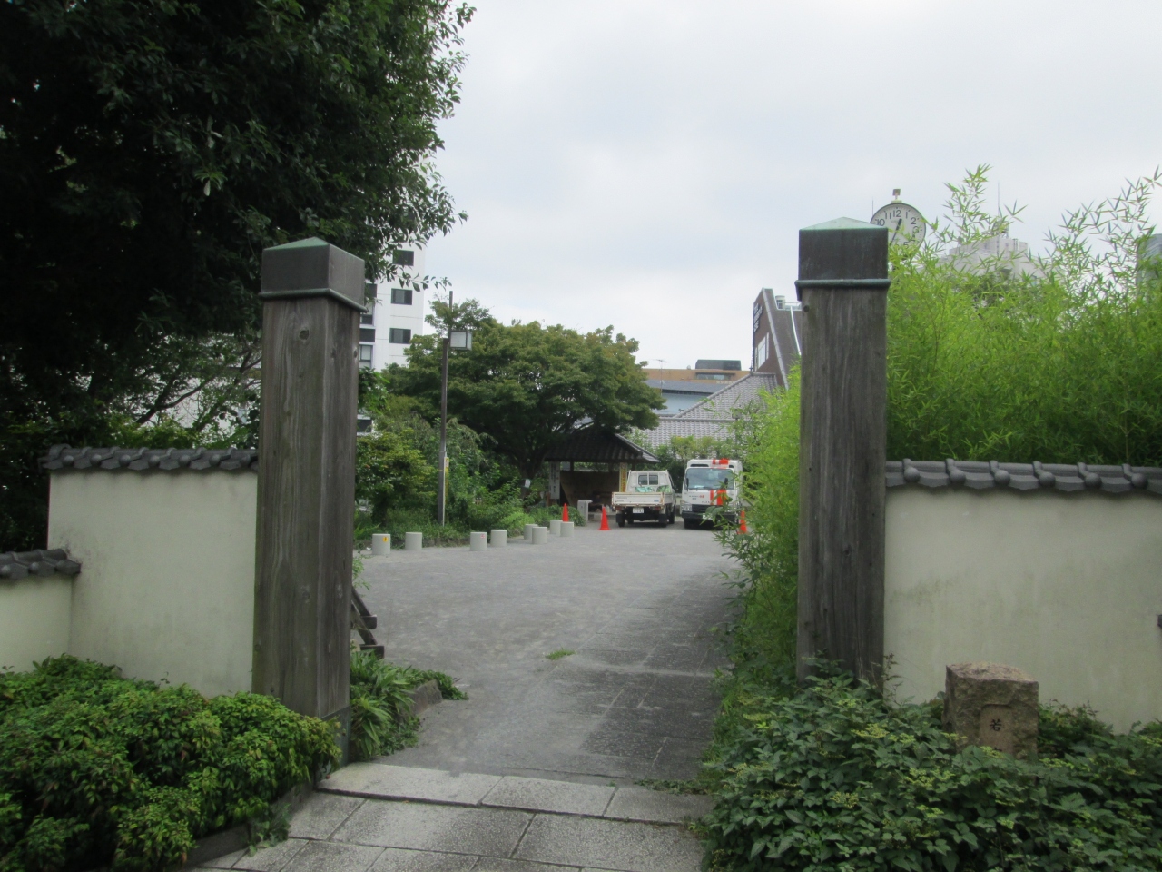日蓮宗の一寺、創建は1638年、開基は肥後藩藩主細川候、開山は妙行院日徳上人、本尊は法華曼荼羅諸尊です。入口正面に鉄筋コンクリート造の二階に本堂があります。整備されているこじんまりした寺社です。今回散策した寺院でも、7割がコンクリート造の本堂で、耐震・耐久の上で、やむを得ないとは思いますが、京都や奈良で多くの寺院を見てきた私にはちょっという感じです。新宿のあるお寺のように、周囲のビルに併せた建物を作り(お寺には見えない外観)違和感のない情景にした方が私にとっては好ましいです