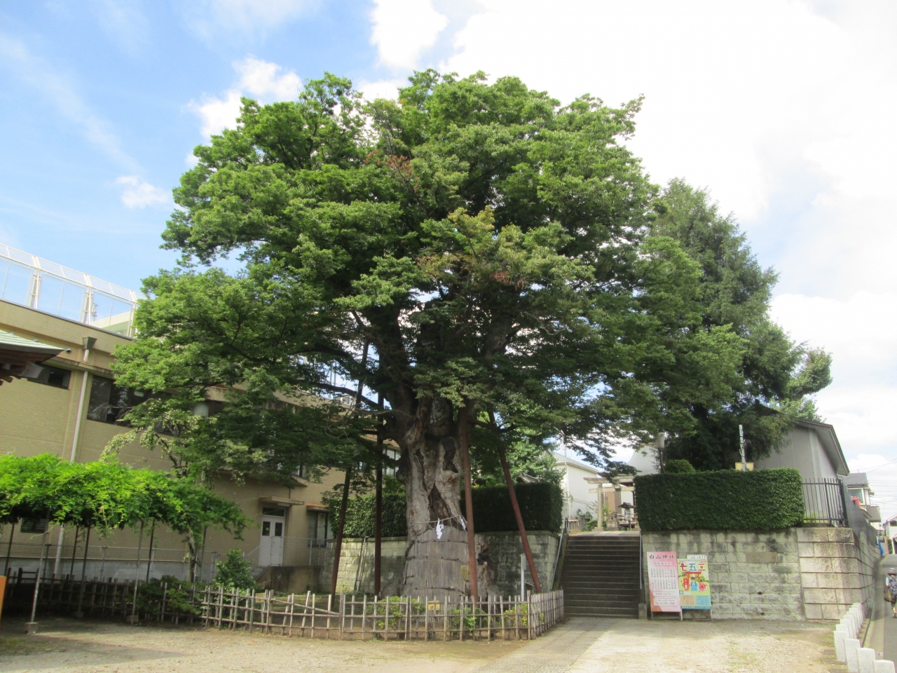 創建は不詳、平安時代、ご祭神はイザナミノミコトです。第一鳥居をくぐると、左に神楽殿、正面に大ケヤキ、石段を登り第二鳥居を潜ると正面に拝殿、その奥に本殿があります。その他石祠、境内社三社稲荷神社、大ケヤキがあります。大ケヤキは国指定天然記念物、源義家が奥州征伐に下る際、戦勝を祈願して、苗を奉納した一部と伝えられる。樹齢7~800 年以上(義家が奉納した物であれば、樹齢は900年を超える)樹高25M、幹回り7Mを超える。樹高25Mを超えるケヤキは他でも見られますが、幹回り7M超えは見たことは無く、圧倒されます