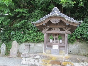 源頼朝が建立した寺(現鎌倉宮付近)の仏堂ともいわれ、諸説あるようです。冠木門の先に薬師堂と石祠があります。薬師堂は頼朝が建立した寺(東光院)内にあったと言われていますが、古い歴史を感じさせる建屋には見えません。堂内に祀られていた県指定有形文化財の薬師三尊像、十二神将は鎌倉国宝館に移され、堂内にはレプリカが安置されているそうです。中は暗くて見えませんでしたが、御賽銭を入れると明かりが灯るということを、見学後、ブログで知りました