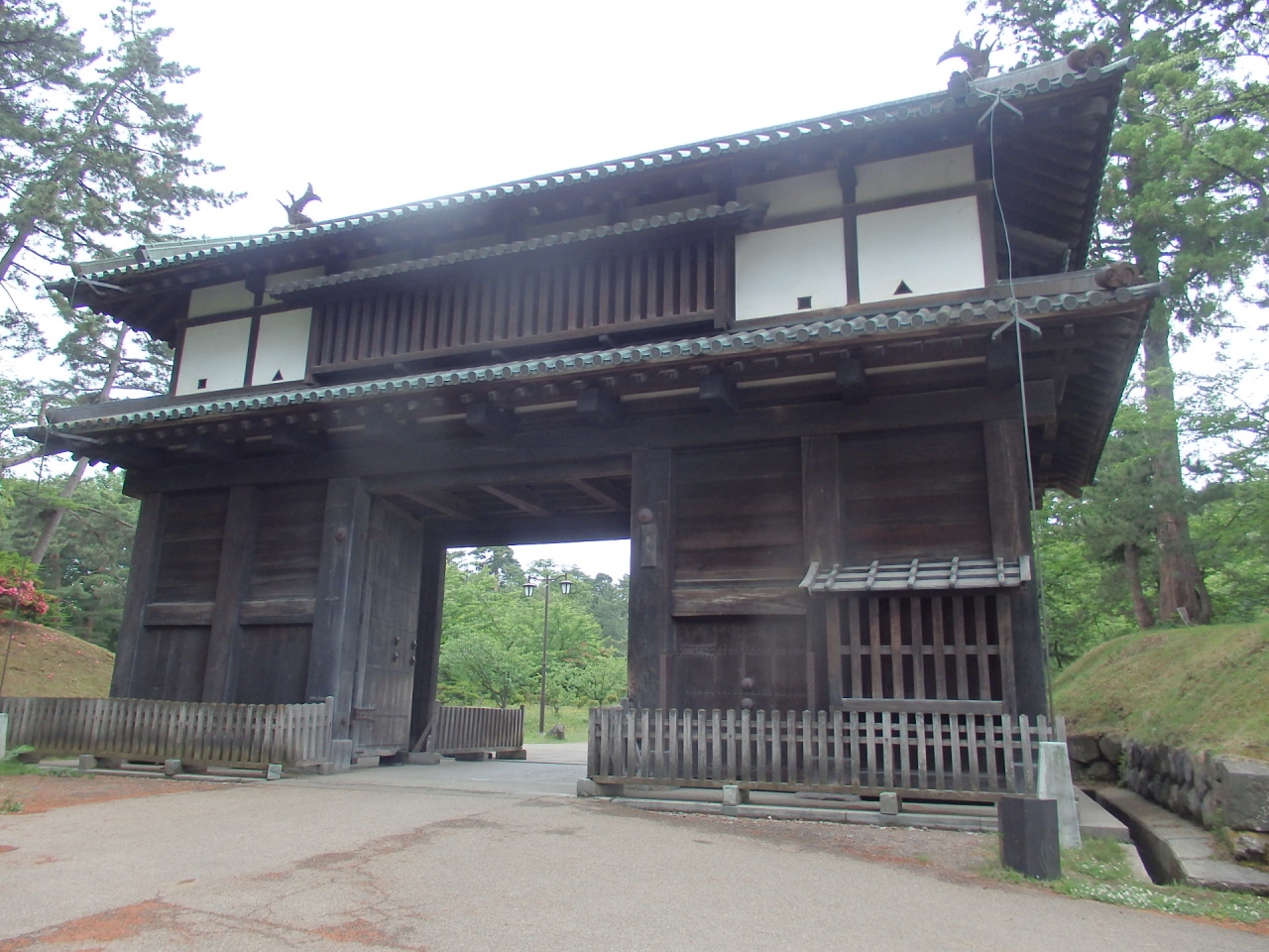 江戸時代、弘前藩津軽氏四万七千石の居城です。三の丸東門は城外から三の丸に入る時に通る門で、国重要文化財です。この東門(一の門)の外に枡形門を形成して、写真の右手前に東門と直角の向き(現在の駐車場からみて正面)に二の門があったと想像できます。二つの門を直角方向に設置して敵から直線的に攻められないようにする防衛手段です。こういうことを想像してお城見物をすることは楽しいものです