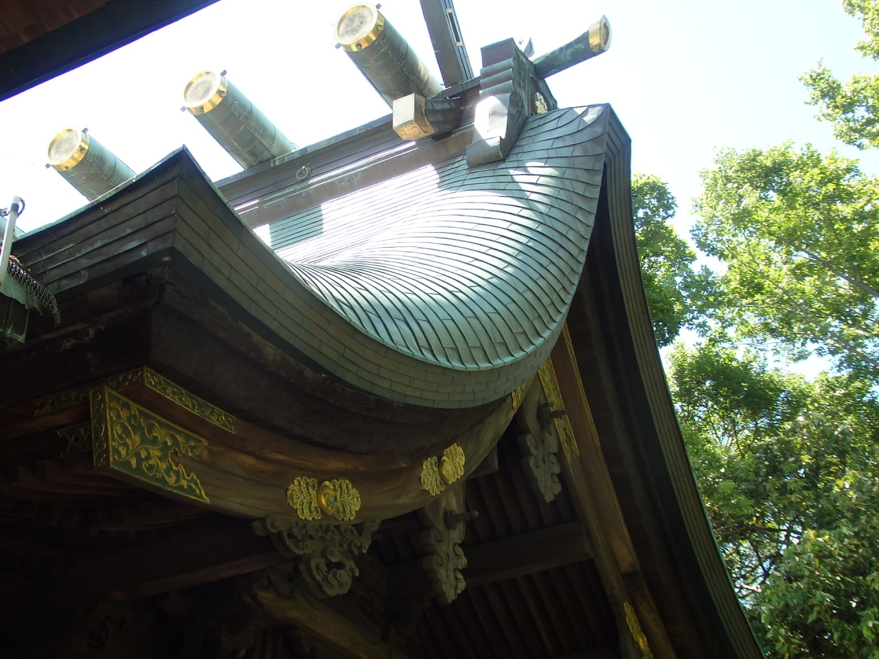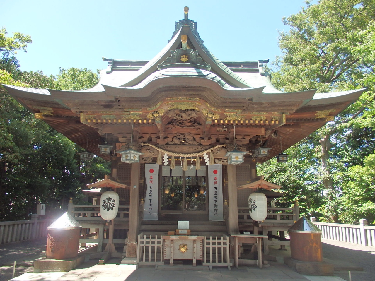 藤沢駅より藤沢宿・遊行寺コースを歩いて1時間30分強の所に白旗神社があります。白旗神社の創立年代は不詳、御祭神は源義経です。藤沢市花の弁慶藤(紫)と義経藤(白)があります。江ノ島弁財天道標の内現存している道標がここにもありました。義経公鎮霊碑や弁慶の力石(この石に触れると病気をしないといういわれがある)等があります。御祭神が源義経だけあって、義経に関わる史跡が多くあります。この辺りには義経、弁慶に纏わる史跡(荘厳寺、弁慶首洗い井戸、弁慶塚等)があるのでこれらを合わせて散策することを源氏ファンにはお勧めします。本殿の切妻側の屋根の曲線、装飾、銅葺屋根が大変見事です。このような屋根はいつも見とれてしまいます