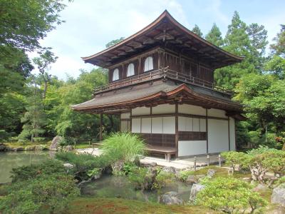 銀閣寺は俗称で正式には慈照寺銀閣という。方丈の前には上段に銀砂灘、向月台と名づけられた砂山のある、銀閣を含む枯山水庭園がある。艶やかさはありませんが砂に段をつけたその景色は情緒があります。その前方に錦鏡池を中心とした池泉回遊式庭園(善阿彌作と言われる)があり、今は緑色の苔がきれいです。数回銀閣寺を訪れていますが、銀砂灘を手入れしている光景を初めてみました。写真で見られるように特殊な用具で波目をつけ、そのあと水を撒き、乾燥すると白い銀砂灘ができあがります。月に2回ほど手入れする程度ですので、その光景を目にすることができてラッキーでした