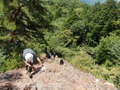 東登山口から急な木段登りを経て38分経塚に到着。ここから嵩山山頂までの岩登りが本日のハイライトです。すぐに鎖のある岩急登りに入る。一人ずつ、ゆっくり登ります。6本目の鎖を経て嵩山山頂(789M) に到着しました。順番を待ち、更に上の大天狗に登る。360度の大パノラマです。本日のコース、昨日の花の山と異なり、野花はほとんど見られない岩山でした。長い6本の鎖が連なる岩場です。高所恐怖症の私にとっては難所ですが、木が遮り両側の下が見えないので恐怖感を感じず、鎖はバランスを保つだけの片手で持ち、もう1本の手は岩をよじ登るようにして登りました。あまり恐怖感は感じませんでした