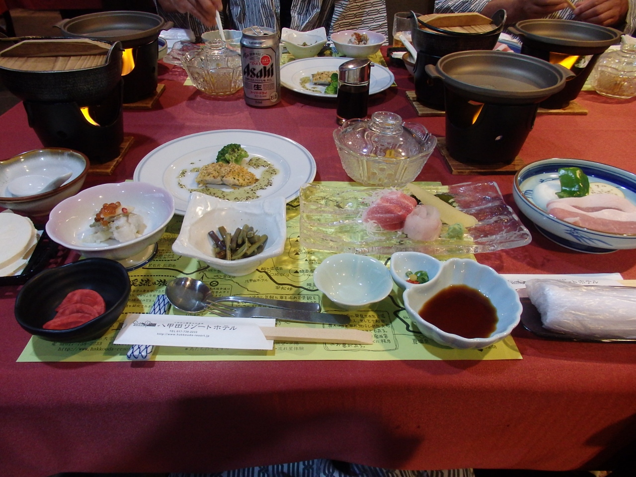 寒水沢温泉にあるホテルで、新青森駅からバスで1時間、八甲田山ロープウエイ山麓駅から3分ほどのところにあります。27日に八甲田山に登る予定で26日に八甲田リゾートホテルに泊まりました。25日の晩に27日は大雨であることが分ったので、急遽登山日を変更して26日に登りました。大きなホテルですが本日の客は我々を入れ3組とのことです。シーズンは夏とスキー時期のようです。宿泊費も期間限定ということで安価であり、夕食も豪華で充分満足できるものでした。無色透明の温泉にゆっくり浸かり、登山の疲れを取ることができました
