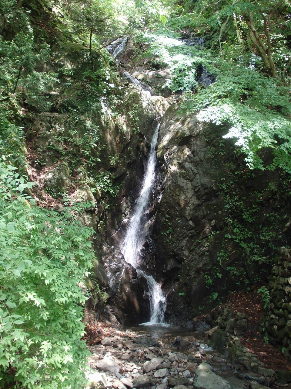 阿夫利神社下社石段の下を右の方に進むと二重滝・見晴台ハイキングコース入口の看板があります。そこの石段をおり4~5分進むと二重滝に到着します。落差10Mほどの滝で2段に分かれています。昔は修験者の禊の行場でもありました。隣には二重社という雨乞いと殖産の守護神である阿夫利神社の摂社があります。森閑と静まり返った中で、わずかな滝の落ちる音が聞えるのみで、心が引き締まる思いです。5分程手前にある阿夫利神社下社の人の喧騒さが嘘のようです