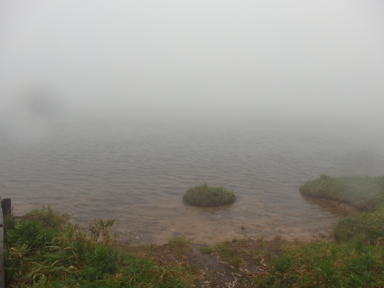 盛岡駅の天気は薄曇り、八幡平頂上バス停では一転して濃霧と霧雨です。バス停右手の石段を下り、トンネルを潜り抜け、見えない鏡沼、めがね沼を通過し、緩やかな登りを経て36分八幡平山頂(1613M)に到着。展望台が建っているが濃霧で回りが見えない。八幡沼北の湿原を歩き、黒谷地湿原まで歩く予定であったが、生憎の天気のため、源太分れで右に行き周遊して八幡平頂上バス停に戻る。本日のコース、標高差50M以下、濃霧と霧雨のため目的地まで行かなかったため、歩行時間も1時間50分、ドラゴンアイや展望台からの針葉樹林帯も見られず、眺望が全くない無い軽ハイキングでした