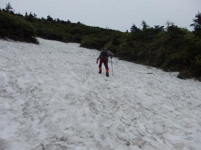 八甲田山ロープウエイ山頂公園駅より、途中野花を愛でながら急登り、下り、湿原を経て2時間強八甲田山避難小屋に到着。昼食後雪渓登りと木段急登りで30分、八甲田山大岳山頂(1585M)に到着。360度のパノラマですが岩木山は曇っていて見えません。ミヤマキンバイ、コケモモ、ミヤマオダマキ、コイワカガミ、ハクサンチドリ、ヨツバシオガマ、イワベンケイ等多くの野花が咲いています。下山は長い急下りを経て酸ヶ湯温泉バス停に向かいました。本日のコース、八甲田大岳までの登りは、標高差500M、急登りもあったが登り易いみちであった。酸ヶ湯温泉までの下りは標高差も900M弱と長く、また岩、石の道急下りが長く、私にとってはきついコースでした。しかしながらさすが花の百名山(日本百名山でもある)、三十種以上の野花が見られ、満足できる山行でした