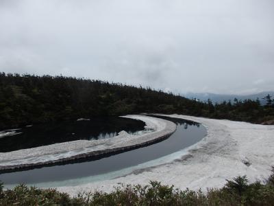 昨年もこの時期に八幡平を訪れていますが、雨と霧で視界はほぼ零ということで、今年リベンジしました。駐車場傍の八幡平入口から出発し15分程で鏡沼に着きます。ここにできるドラゴンアイを見に行きました。沼に積もった雪が解け始めるころ、中心部(黒目に相当する部分)と白目の部分に相当するところの雪が解け、その姿が龍の目に見える現象です。今は丁度、眼球の上半分が無くなってしまい、黒目大きくなってしまった状態に見えます。良い状態で見られるのは1週間ほどの期間と言われていますので、一旦が見られただけでも満足です。自然を相手とするタイミングは難しいものですね。ちなみに今年は6月10日頃がベストだったようです