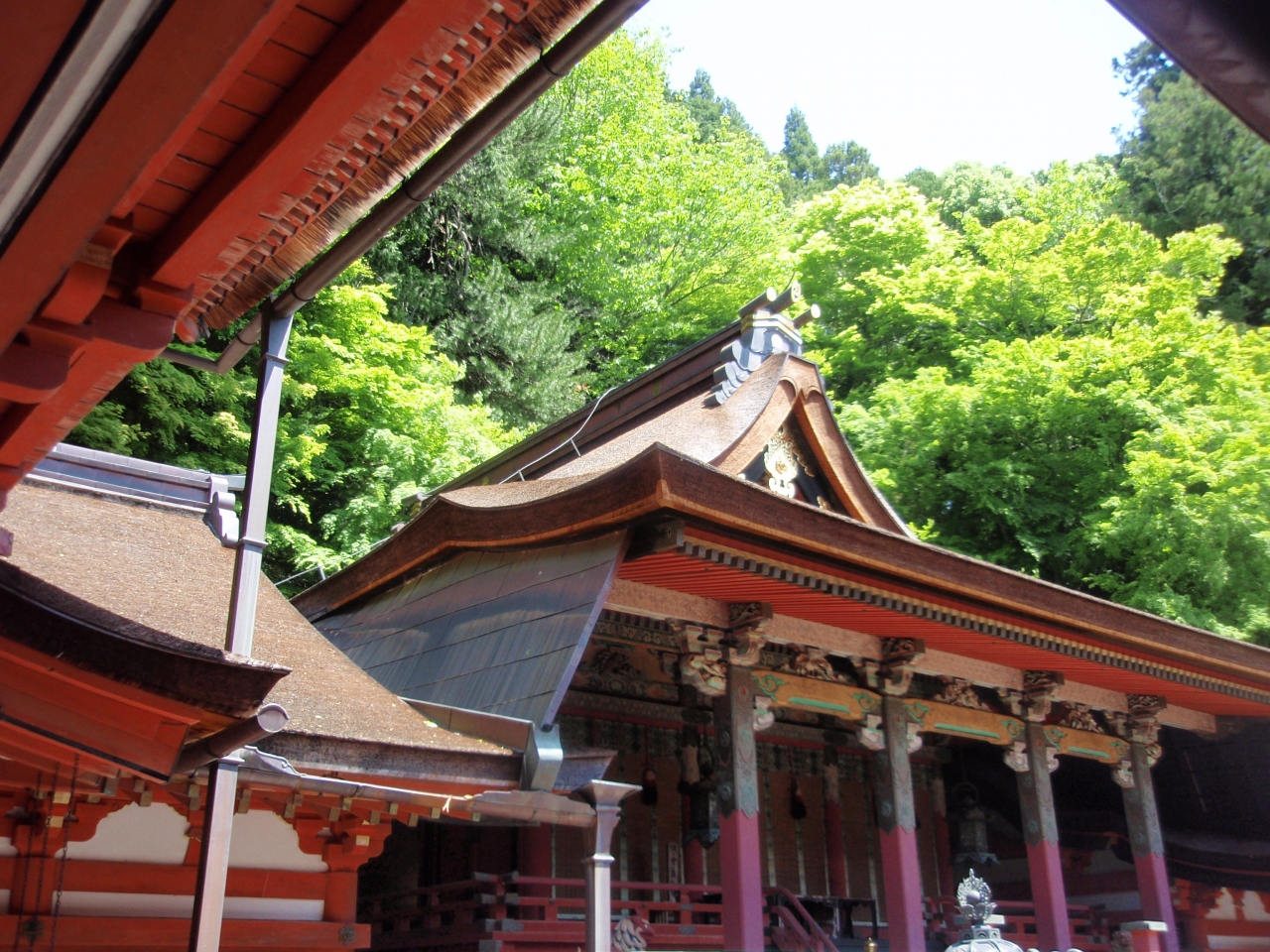 創建は678年、主祭神は藤原鎌足。藤原鎌足の息子定恵が父の墓をこの地に移して十三重塔を建てたのが始まりです。石造十三重塔、摩尼輪塔、石灯篭、拝殿、本殿、東西に宝庫2軒、十三重塔、権殿(旧常行堂)、その他境内者社等国重文、県市指定の文化財を多く有します。これらを見るだけでも十分満足できます。本殿にはきれいなカーブを持った檜皮葺の屋根、朱色の柱、極彩色の彫刻が見られ感激します。今、紅葉の緑がきれいであり、秋の紅葉時に再度訪れてみたいものです。明治時代の廃仏毀釈で寺は廃寺され、神社として存続したので、名は神社ですが寺院の雰囲気が感じられました