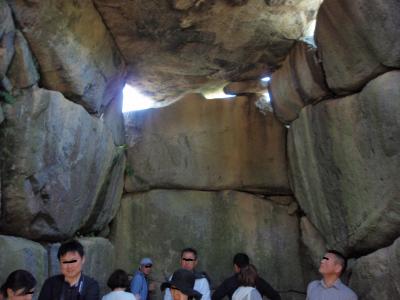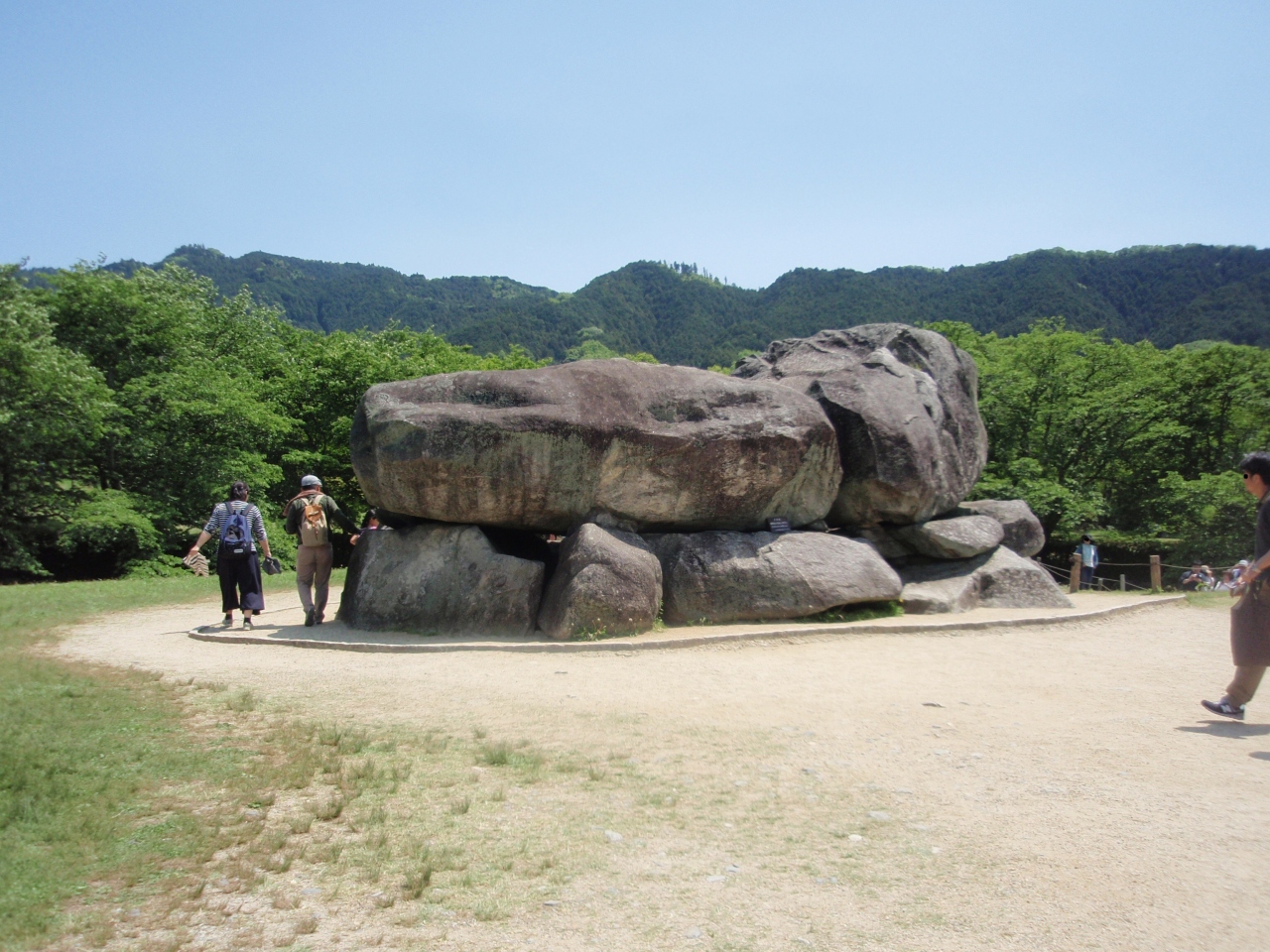古墳時代後期(七世紀前半)の古墳で、土が失われ横穴式石室が露出したものである。石室の屋根の部分が舞台のように見えることから石舞台と言われています。蘇我馬子の墓と言われている。三十数年ぶりにお目にかかり感激しました。六十年程前に高校の修学旅行で訪れた時には周りは柵をはじめ何も無かったと記憶しています。人力では動かせないような巨石の組み立て法を説明する版があり、なるほどと納得しました。ゴールデンウイークの真っ最中、多くの観光客がおりました