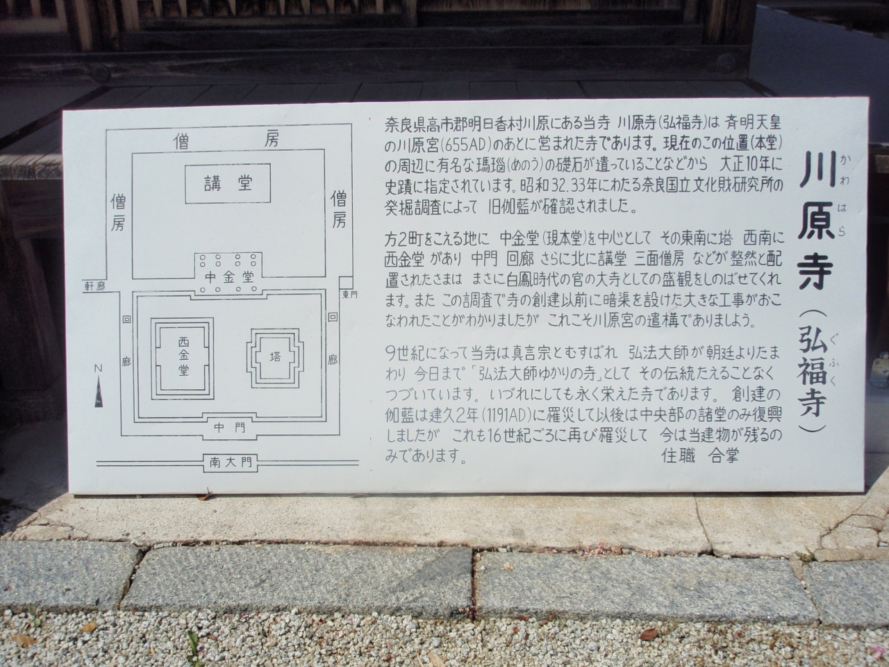 川原寺は中大兄皇子が母斉明天皇の冥福を祈るために建てられたといわれています。広場の中に礎石と説明版があるのみです。飛鳥四大寺の一寺で、創建は不明。廃寺後江戸時代中期に旧金堂跡に現川原寺(弘福寺)が建立され、現在に至ります。川原寺跡に来て気が付いたのですが、橘寺から見下ろすと川原寺の広大さが想像しやすいのではないかと思いました