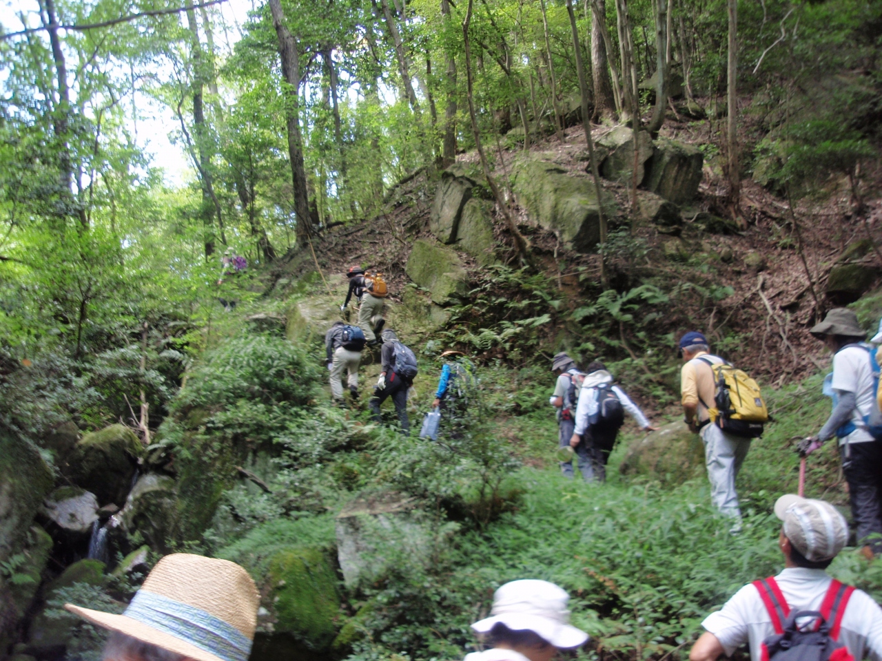 南海紀見峠駅を出発し、ダイヤモンドトレイルを歩き、数回の木段急登りや九十九折れの急登りを凌いで、2時間半強岩湧山(897.7M)山頂に到着しました。前方が開け金剛山、葛城山、南葛城山等が見えます。秋にはカヤトが一面に生え美しい光景が見られるところですが、今は未だ少し穂が出てきた程度です。帰りはザレた急下り、木段急下りをして滝畑バス停に降りました。本日のコース、標高差は660M強、木段急登りも数回あった割には疲れを感じませんでした。気温が30度を超えていなかったせいでしょうか。山頂からの眺望も見事であり、また野花も十数種類見られ満足できる山行でした