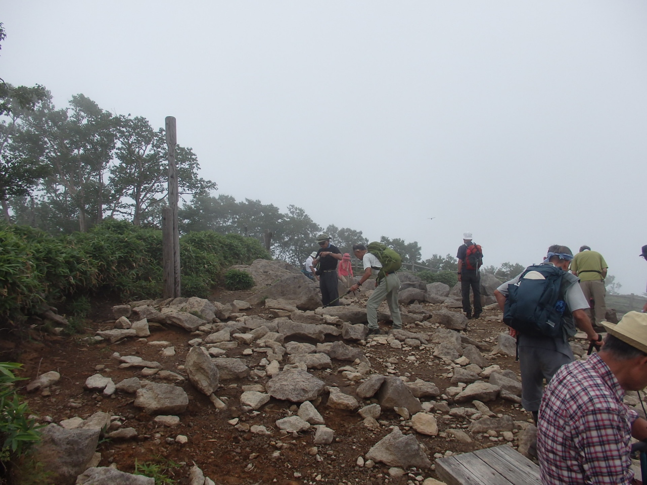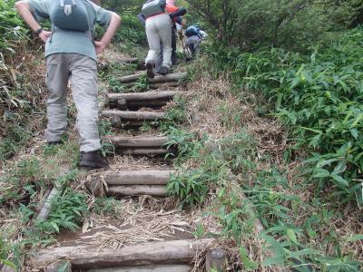霧降高原レストハウスより1445段の木段を登り(一部遊歩道巻道が付いている)、1時間ほどで小丸山通過、この後急登りして、歩き始めて1時間半強、丸山山頂(1689M)に到着しました。霧で遠望は利きません。急下り、緩やかな下り、平坦を繰り返し霧降高原レストハウスに戻りました。本日のコース、標高差は340M、歩き易い登山道、天気も曇り(直射日光が当たらず)であったので真夏にしては楽な山行でした。道中20種以上の野花が見られ満足できる山行でした