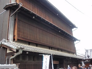 旧川本邸で登録有形文化財です。木造三階建ての目立った遊郭建築です。意匠を凝らした欄間や数寄屋造りの小部屋等の建築技法、客と女性が並んで登った大階段にお雛様が飾られているのを見たかったのですが、2,3日前に毎日放送のテレビ番組「ちちんぷいぷい」で紹介されたせいか大勢の人が外に並んでいましたので、見るのをあきらめ次に進みました