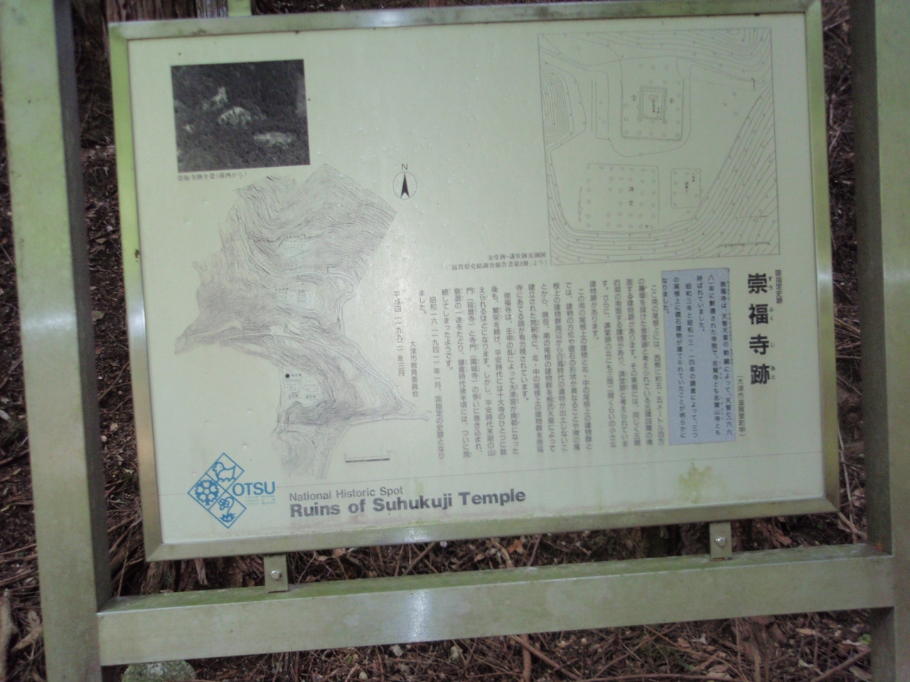 崇福寺は天智天皇勅願時で、七世紀に建立されました。鎌倉時代後期には廃寺となりました。現在国指定史跡になっています。発掘調査の結果、銅鈴、ガラス玉、紫水晶等が発見されています。北尾根の弥勒堂、中尾根の三重塔、小金堂、南尾根の金堂、講堂(こちらは梵釈寺の遺跡と言われる)の3ケ所に分かれ、標高差はあまりありませんが、急な登り下りのある木段で繋がれており、また急登りの旧石段参道があり、歩くのが苦手の人には一苦労します。往時のスケールの大きさは想像できます。説明版はありましたが、更に出度品の写真等あると更に興味が増すのではないでしょうか