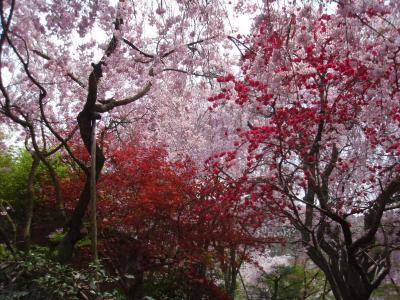 4000坪の苑内に二十数種類の桜(枝垂れ桜、大島桜、御衣黄黄桜、御衣黄緑桜等)が満開で、あまりの美しさに千数百円の入園料が高価と感じさせない風景である。ソメイヨシノの桜の名所は全国に多くあるが、どの名所もこれに勝るところは無いように思えるほどである。桜以外にゆきやなぎ、ぼけ、吉野つつじ、れんぎょう、かいどう、山吹(黄、白)、石楠花が満開で見られた。ただウイークデーにもかかわらず、人の多さにはびっくりする。足に自信のある人は仁和寺の御室桜を見て徒歩で原谷苑により、金閣寺まで足を延ばすルートもありますよ。