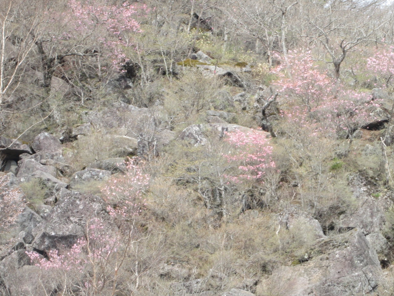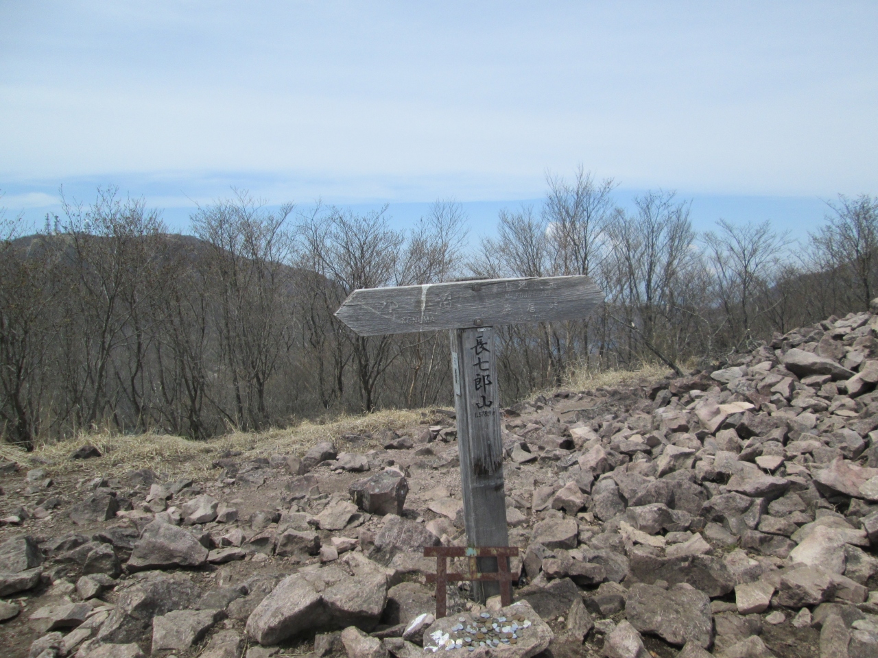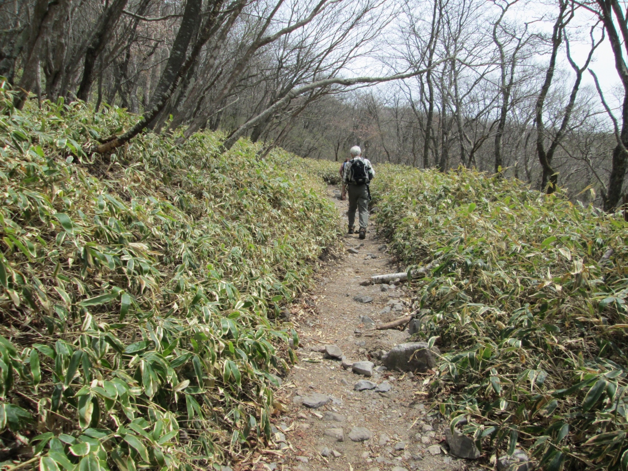 赤城山は一つの火山体の名称で、本日はその中の一つ長七郎山に登りました。小沼駐車場から出発して、緩やかに登ります。土の道で大変歩き易い道です。本日、富士山は見えませんでした。急な登りも無く、歩き始めてから35分長四郎山(1578.9M)山頂に到着しました。地蔵岳が見えます(六年前に登っています)。この後小地蔵岳に寄りました。下山は山地図にある実線ではなく、点線で示されている北へ下るルートを下りました。踏み後も薄く、またリボンもほとんどないコースです。ただ下の大沼が見えているので、道に迷うことはありません。最初は緩やかでしたが、途中からは木に掴まりつつ慎重に下だります。(私の体力では登りに使用することはできません)。40分ほど下って実線の登山道に入り3分程で鳥居峠に到着しました。標高差は150M弱ですから、実践ルートだけの歩きでしたら、山を歩いたという気分にはならなかったでしょうが、急下りをしたことで印象に残りました。鳥居峠ではアカヤシオが咲いており花を添えてくれました