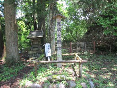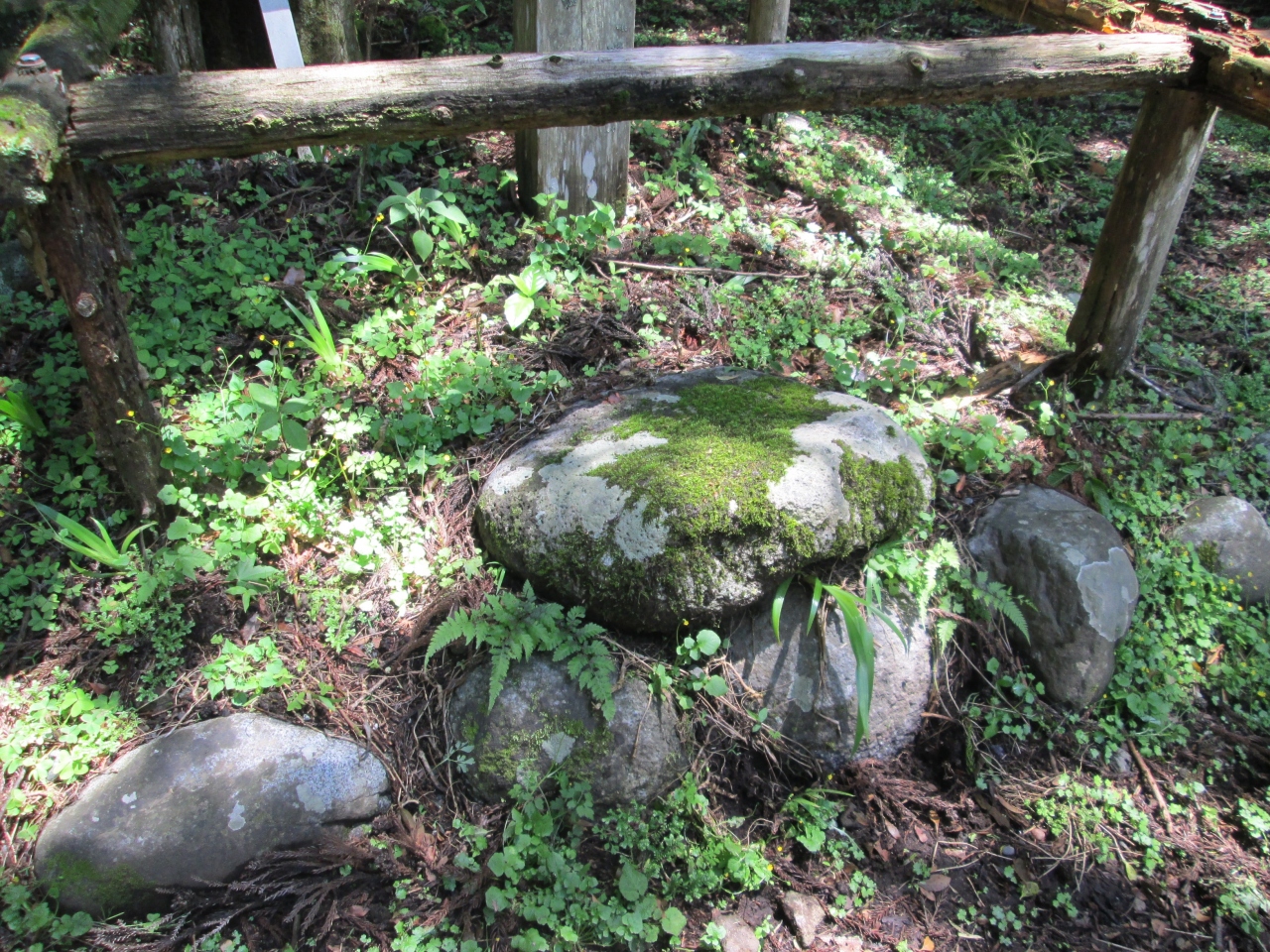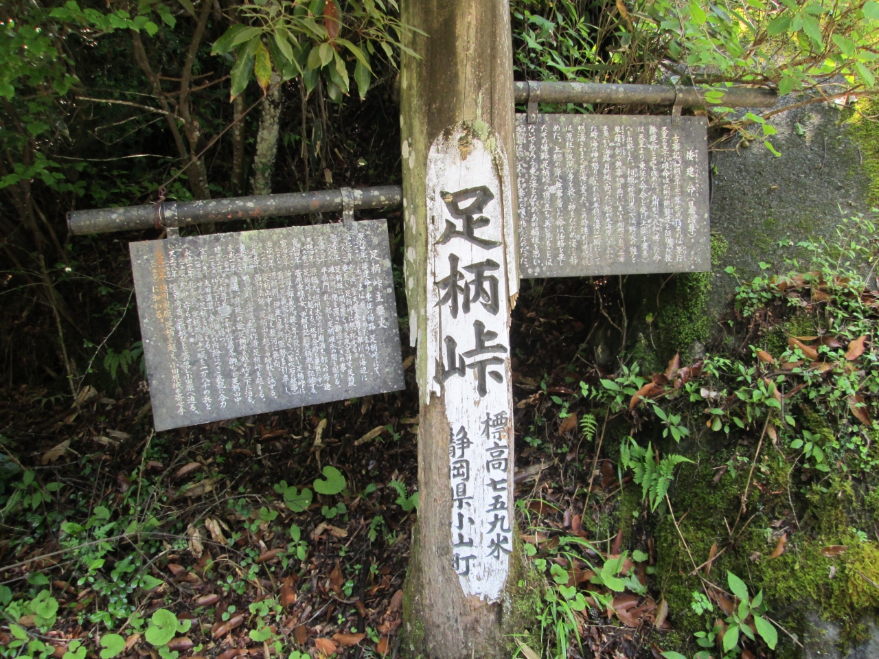 バス停から旧古楢尾道を登り、足柄万葉公園手前の約40分の木の根道の急登りを凌ぎ、万葉公園を経て、歩き始めて2時間20分足柄峠(標高759M)に到着しました。足柄の関跡は足柄峠標識の直ぐ傍にあります。詳細な場所や規模は不明の様です。歴史は古く九世紀末この付近を荒らしまわった強盗団を捕縛するために作られたそうです。足柄古道は一里塚が付近にあるところから江戸時代の初めはまだ官道の一つだったと考えられます(箱根路の畑宿を通る旧東海道が出来るまでの間)。関跡にはおじぎ石なるものがあります(旅人はこの石手をついておじぎし、手形を差し出したと言う)。これだけを目的に来るようなスポットではありませんが、足柄城址や足柄万葉公園等他のスポットと併せて見るのがベターです