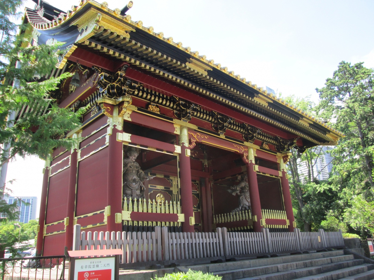 プリンスホテル正面にある門は徳川第七代将軍家継の有章院霊廟の惣門で、二天門と言い、1717年造営の国重重要文化財ですが、現在は株式会社プリンスホテル所有です。門内には、凛々しい姿の西方を守る広目天と北方を守る多聞天が祀られています。鮮やかな朱塗りに所何処に金色を配した八脚門の惣門で見事です。四天王の持国天と増長天は六代将軍家宣の文昭院霊廟の門に祀られていましたが、東京大空襲で焼失してしまったそうです。残念ですね