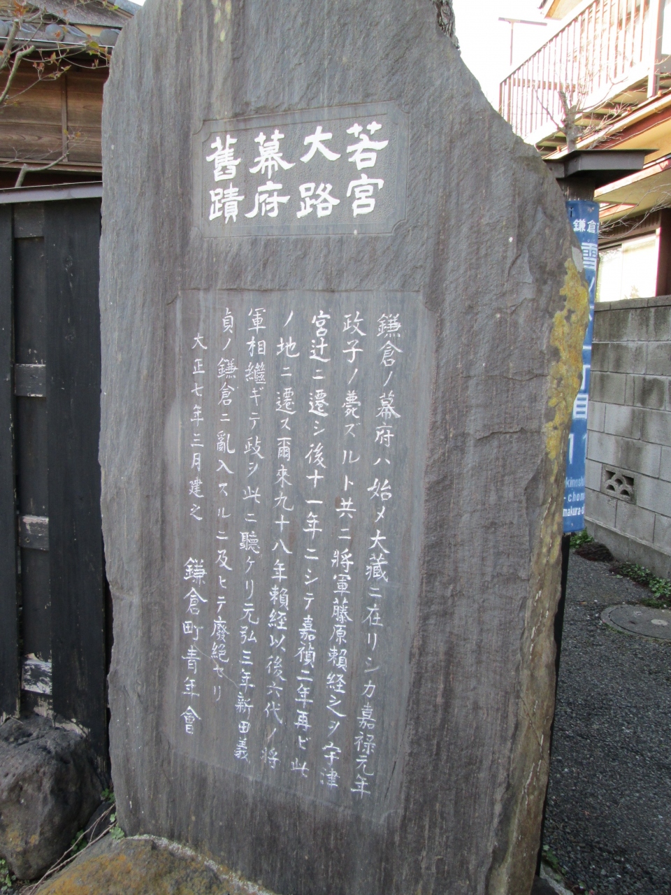 大路幕府旧蹟碑は若宮大路と小町大路の間の小路に建っています。鎌倉第四代将軍藤原頼経の時代から鎌倉幕府が滅びるまでの98年間ここが鎌倉幕府の中心地になりました。一寸わかりにくい所にあり、鎌倉は家の庭という鎌倉通の友人の案内でここに来ました。碑のみの説明で、想像することは全くできません。発掘調査などをしているのであれば、その際の写真等でも設置されていれば多少は理解できるのではないかと思われる