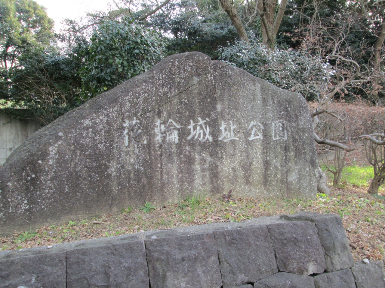 花輪城の築城主は平本定虎、築城年は不詳、廃城1590年です。公園入口には公園石碑が建っており、城址公園になっています。登城口から石段を登ると、空堀と土橋のある、小さな郭になっており、室町時代創建の西福寺(現西栄寺)の観音堂の礎石が保存整備されています。土塁らしきものが周りに見られます。本郭らしきものがありません。遺跡は土塁、空堀、土橋、郭跡等がみられ、満足できる城址です。遊具のある公園ではありませんが散歩するには良い公園かもしれません