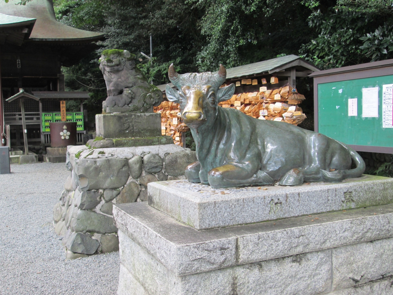 創建は903年、御祭神 は菅原道真公です。道真公三男道武が父を祀る廟を建てたことに始まる。第一鳥を潜ると、社叢、第二鳥居、境内社三社合殿、神楽殿、座牛、右正面に拝殿、その奥本殿、境内社厳島神社、境内社五社合殿があります。東に梅林があり、山口瞳文学碑、展望所等があります。道真公を祀る神社には座牛が置かれています。これは道真公の遺骸を運ぶ牛が座り込み動かなくなり、ここを(太宰府天満宮)墓地に定めたという逸話があります。ここから道真公(天満宮)と座牛の関係が生まれてきました。牛を撫でると多くの御利益があるそうですが、筆頭は合格祈願です。また拝殿軒下の彫刻が見事です