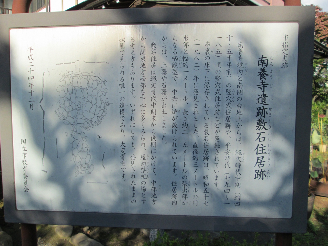 臨済宗建長寺派の一寺、創建年は不詳ですが、十四世紀中ごろ、開は立川入道宗成、開山は真照寺大定禅師物外可什和尚、本尊は釈迦如来像です。藥井門の山門を潜ると、庚申塔、地蔵尊、観音像を安置する大悲殿、十八世紀に建てられた鐘楼、十九世紀初めに建てられた本堂、石造五重塔があります。歴史を感じさせる藥井門、庚申塔、地蔵尊、本堂、大悲殿、梵鐘等見処の多い寺院です。本堂北に枯山水の庭がありますが、入れません。扉越しにちょっと覗くことができました。庫裏の床下に南養寺遺跡敷石住居跡の敷石が保存されているのですが、これも見られません